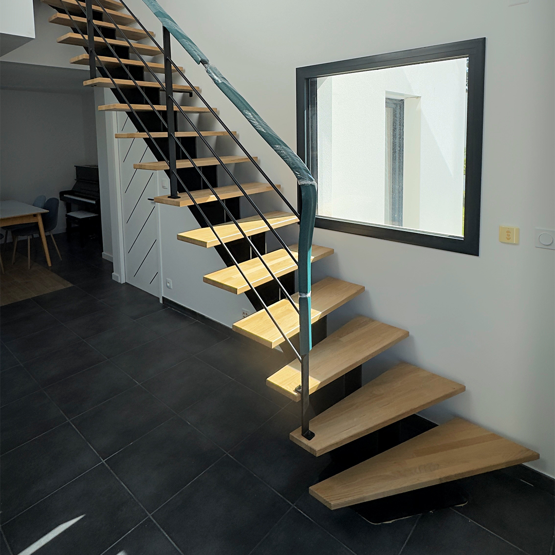 Embellie par un limon central en métal, l’escalier joue sur le contraste des matières. Le bois et l’acier se répondent harmonieusement. Ce choix technique met en valeur la ligne de l’escalier tout en assurant une excellente stabilité.