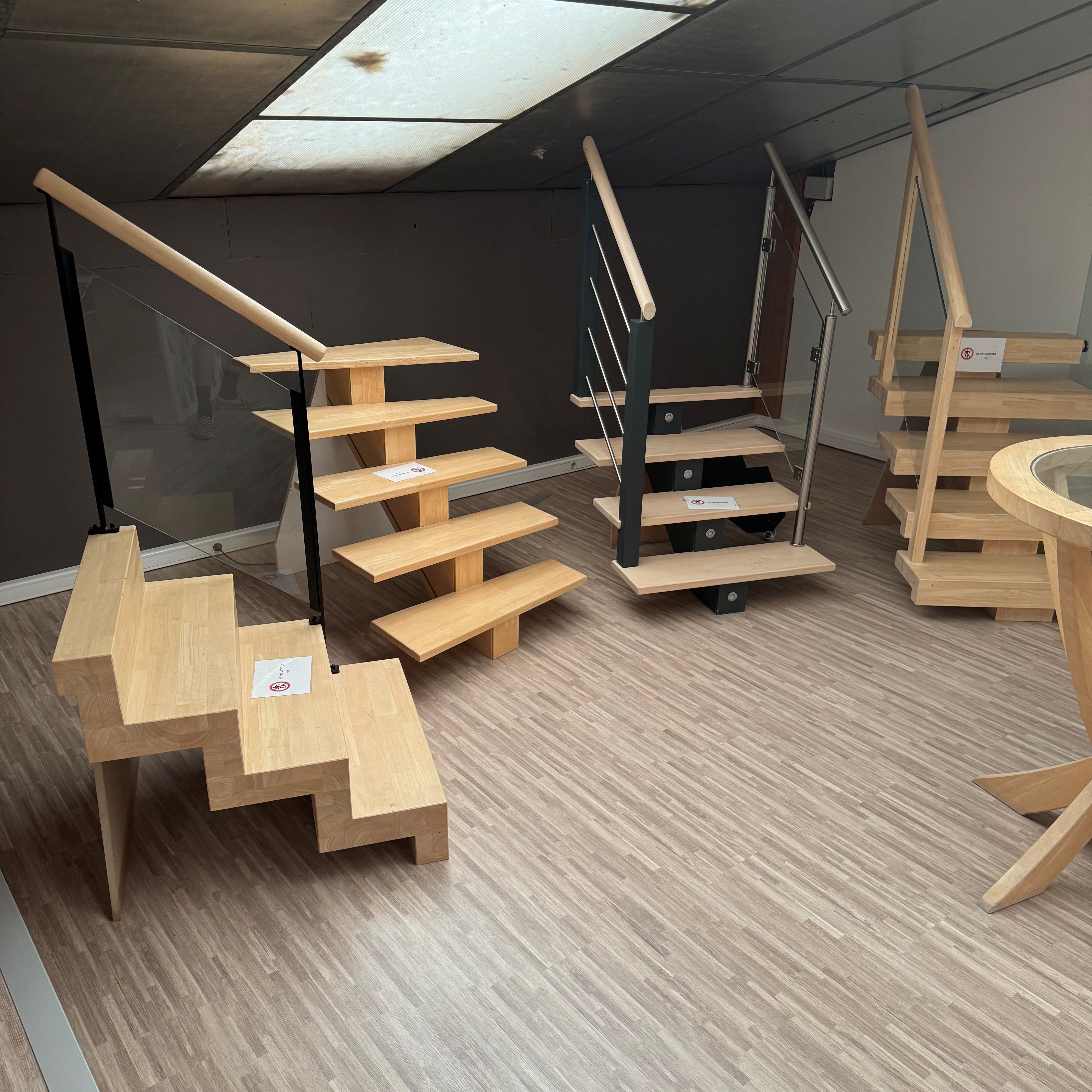 Vous y trouverez de nombreux modèles d’escaliers exposés, aux styles variés : contemporain, traditionnel, minimaliste, design… Vous pourrez comparer les essences (chêne, hêtre, frêne, bois exotique…), les types de limons, les garde-corps (en bois, en métal, en verre), les finitions, et toucher les matériaux.